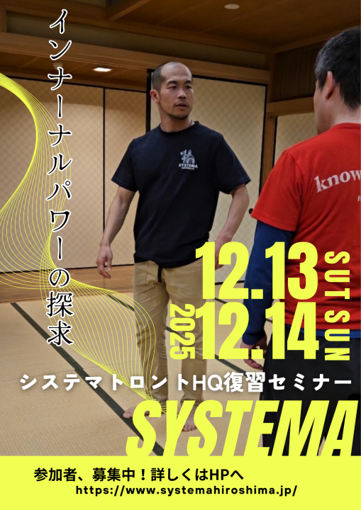 システマ広島では、2025年12月13日(土)・14日(日)の2日間にわたり、**「システマ トロントHQ復習セミナー:インターナルパワーの探求」**を開催します。